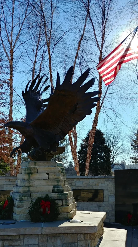 was dedicated Oct 30, 2005. The memorial was built with private funds from generous donors and recognizes and honors county veterans from all branches of service weather they served in peace time or in war. Names of county residents who gave their lives in the service of their country are etched in granite monoliths surrounding a bronze sculpture of a bald eagle, “Sovereign Wings” by artist Sandy Scott.